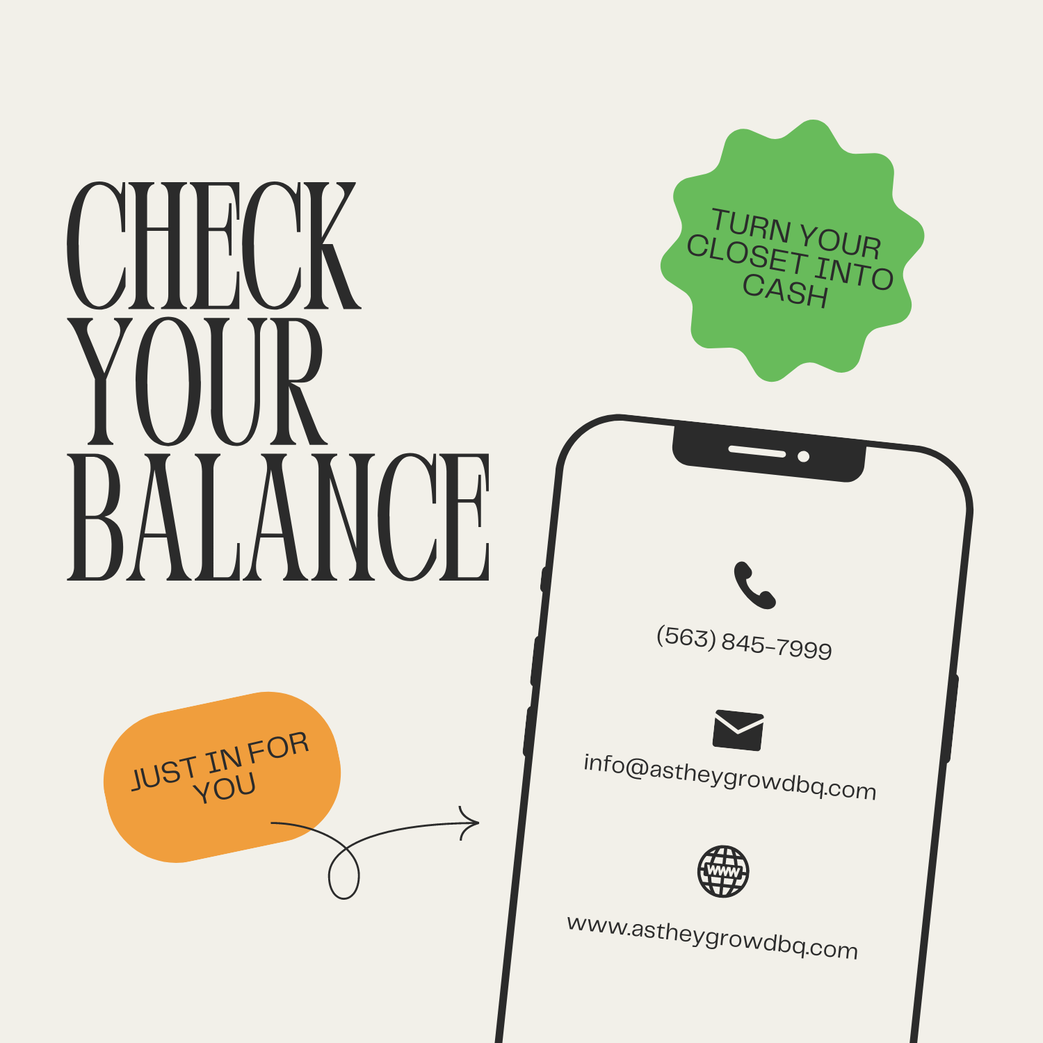 Curious about your earnings? Log in to our consignor portal and check your balance anytime. It's quick, easy, and keeps you updated on your consignment success!